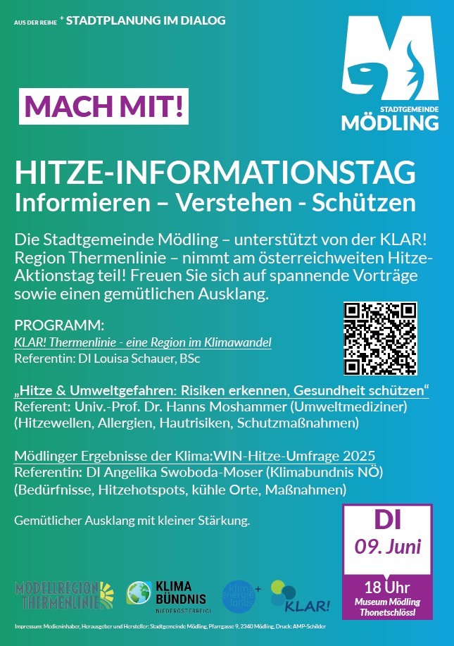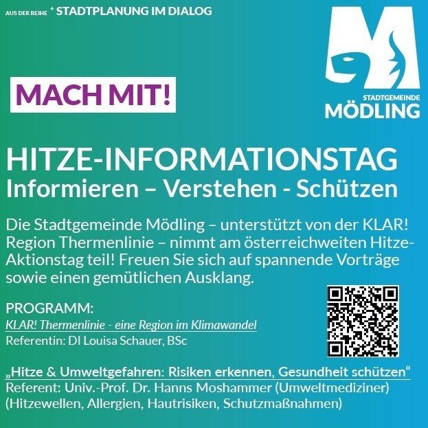 Im Rahmen des österreichweiten Hitze-Aktionstages lädt die Stadtgemeinde Mödling gemeinsam mit der KLAR! Region Thermenlinie zu einem vielseitigen Hitze-Informationstag ein.