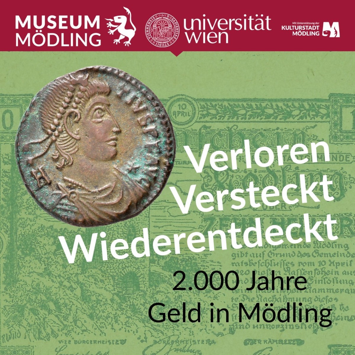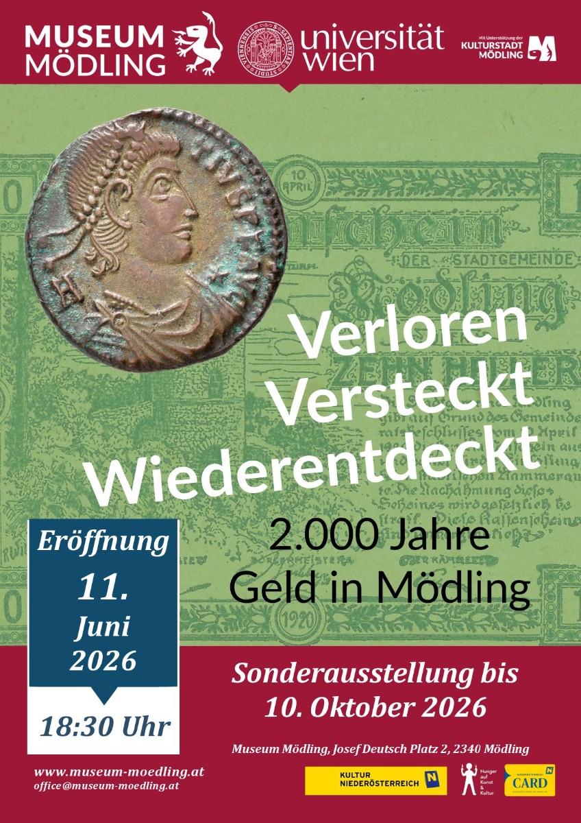 Anhand von Fundobjekten aus dem gesamten Bezirk wird die Geldgeschichte der Region von der römischen Zeit bis in das 20. Jahrhundert erzählt. Die Sonderausstellung wurde von Studierenden des Instituts für Numismatik und Geldgeschichte der Universität Wien gestaltet. Die feierliche Eröffnung findet am 11. Juni 2026 um 18:30 Uhr statt. Danach kann die Geldgeschichte Mödlings bis zum 10. Oktober erkundet werden.
